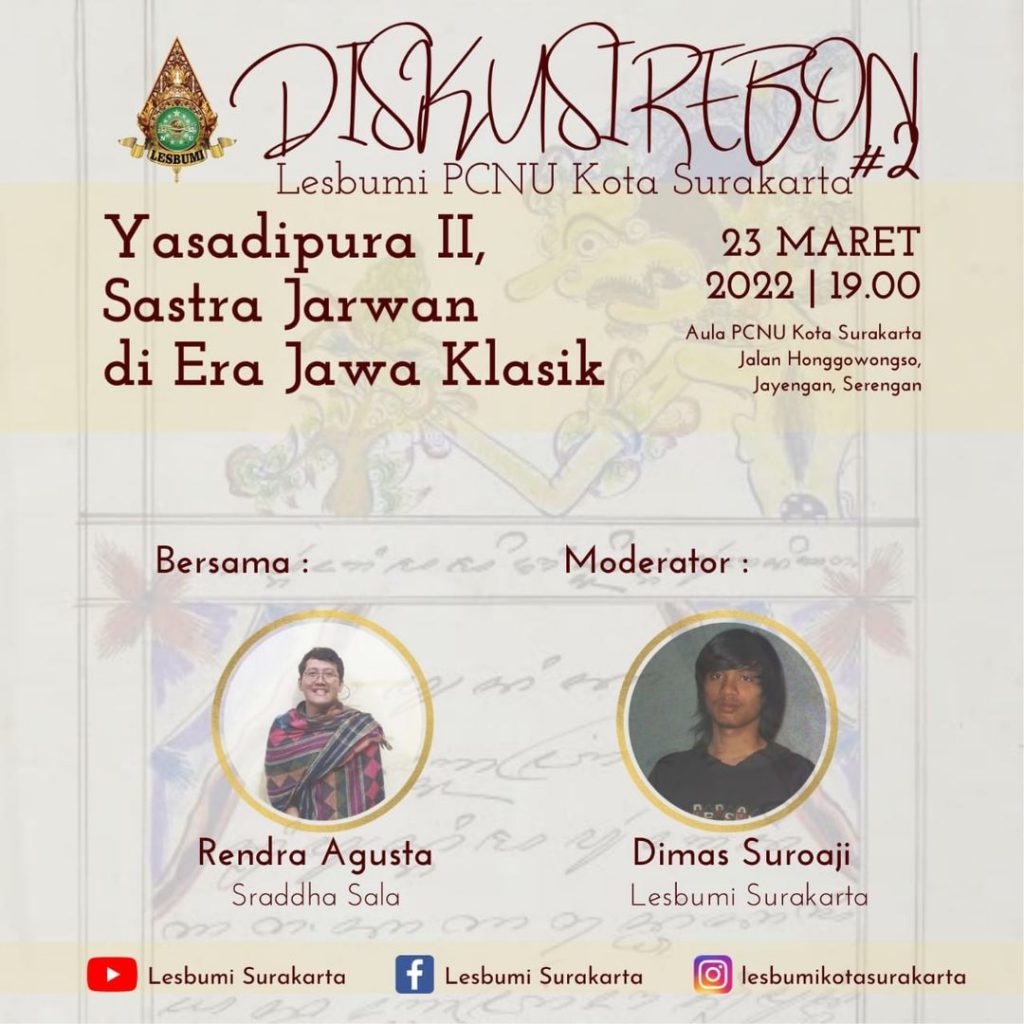 Diskusi Rebon Lesbumi Kota Surakarta —Kali ini mengangkat tema Sastra Jarwan masa R.Ng. Yasadipura II (T.Sastranagara). Acara pada 23 Maret 2022 di Aula PCNU Surakarta. Acara diskusi ini bersama Rendra Agusta dari Sraddha Institute Surakarta.